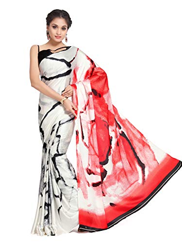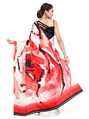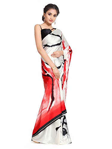 Womanista Women white & red Satin Crepe printed saree. Comes with satin un-stitched Blouse. Wear this trendy yet smart saree for your next party