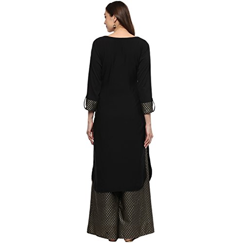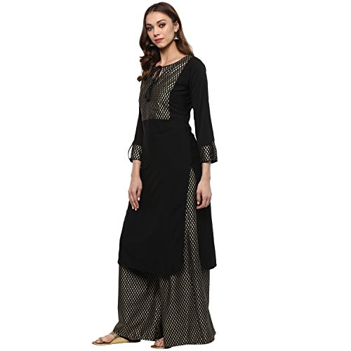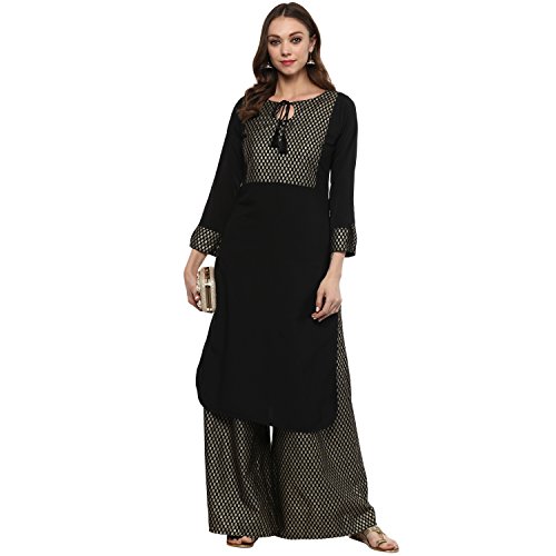 Lusting after luster when you wear this black colour kurta palazzo set by ZIYAA. Crafted from crepe fabric, it is light in weight and will be soft against your skin. Its unique design and beautiful colour will fetch a lot of second glances as you club it with contrast coloured pumps and flashy accessory.